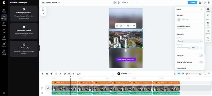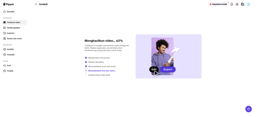AI secara otomatis mengedit videomu sesuai prompt dan foto yang diunggah. Sistem mengatur transisi, tempo, dan sorotan visual. Di tahap ini, kamu bisa menerapkan efek glow agar tampilan lebih cerah dan kreatif. AI juga menambahkan avatar, caption, atau elemen visual lain sesuai kebutuhan.