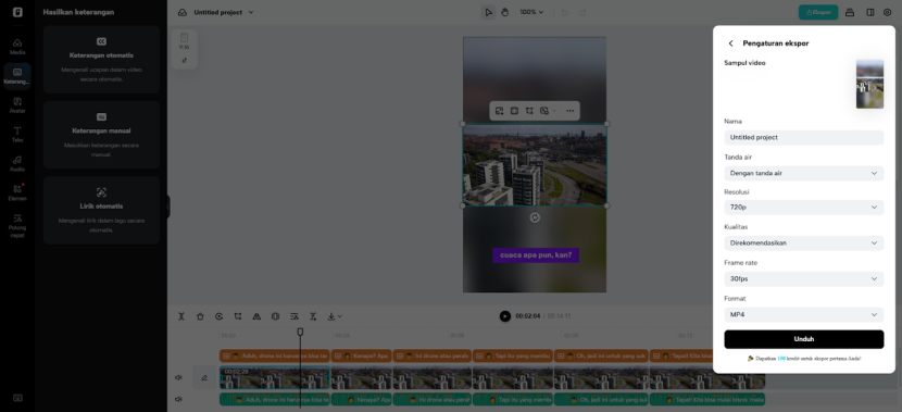 Setelah videomu terlihat pas, klik tab "Export". Bagikan langsung ke TikTok, Instagram, atau Facebook dengan menekan "Publish". Jika ingin menyimpan ke perangkat, pilih "Download" dan tentukan format, resolusi, serta frame rate.